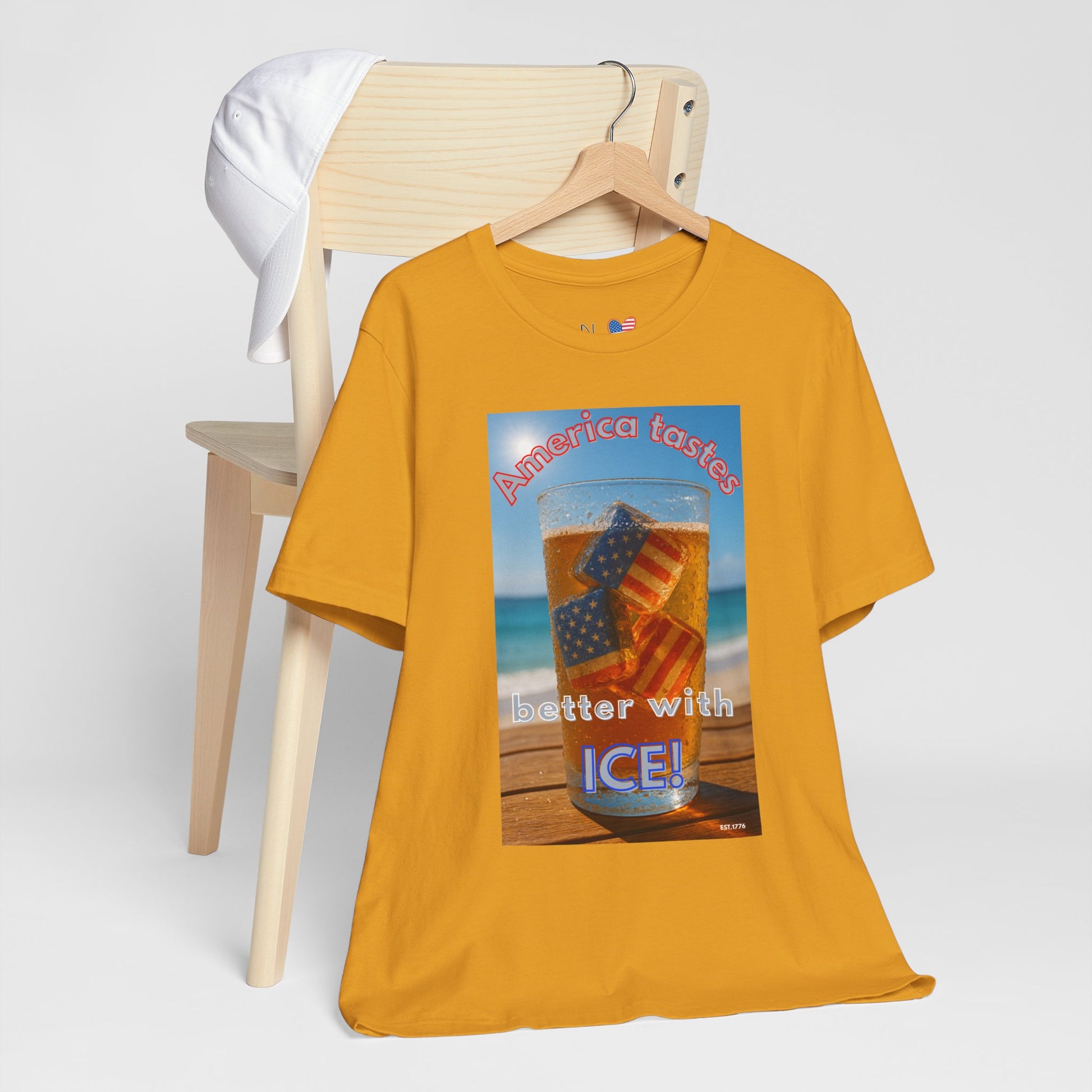 Patriotic summer tee that screams 'America Tastes Better with ICE', ideal for BBQs and casual outings. Perfect for adults looking to show off their patriotism during holidays like Memorial Day, July 4th, and Labor Day.